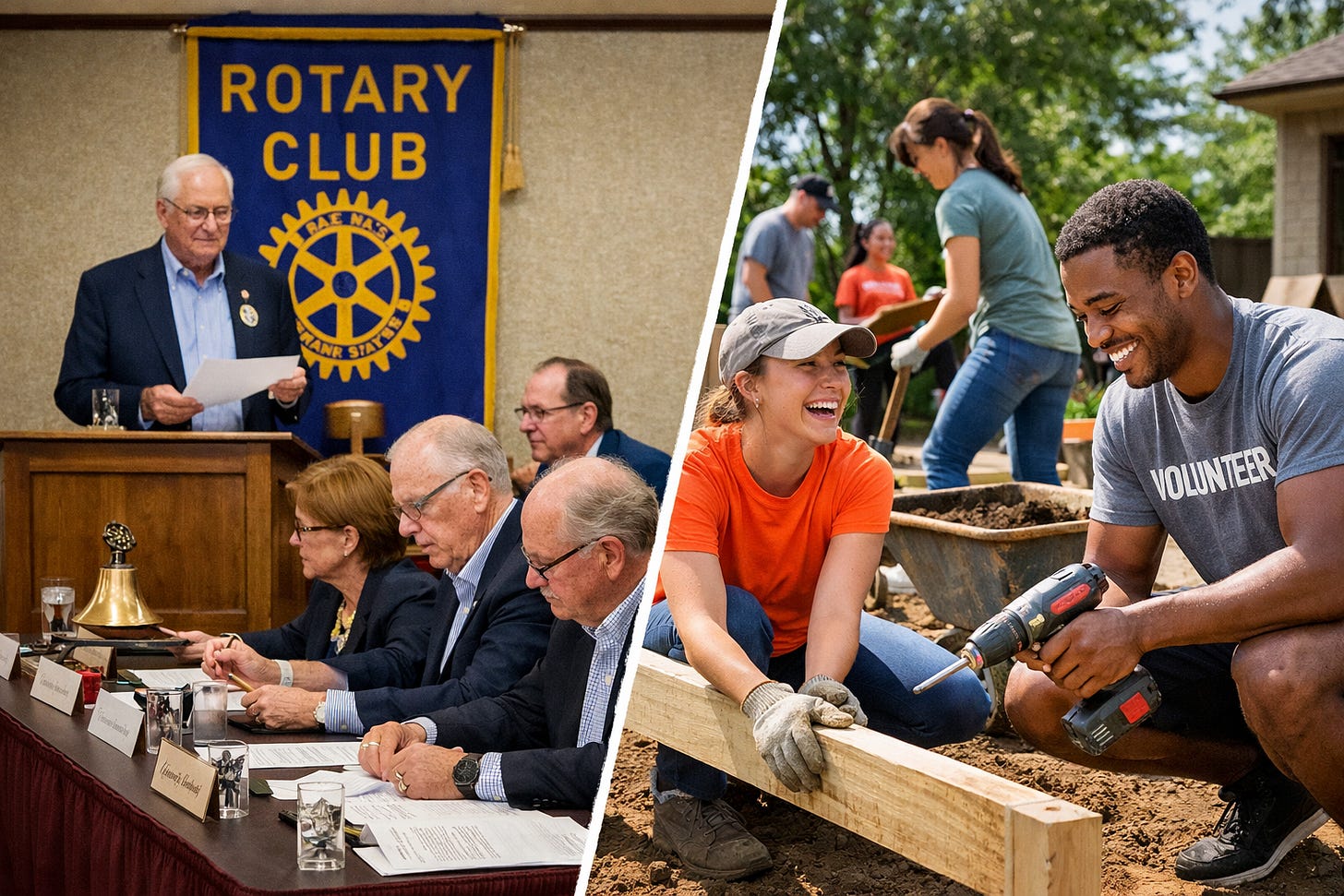 Younger generations, especially Millennials and Gen Z, want impact now. They want flexible, value aligned ways to serve. They are far less interested in hour long meetings, formal induction rituals, or spending limited free time on ceremonies that feel outdated or performative.